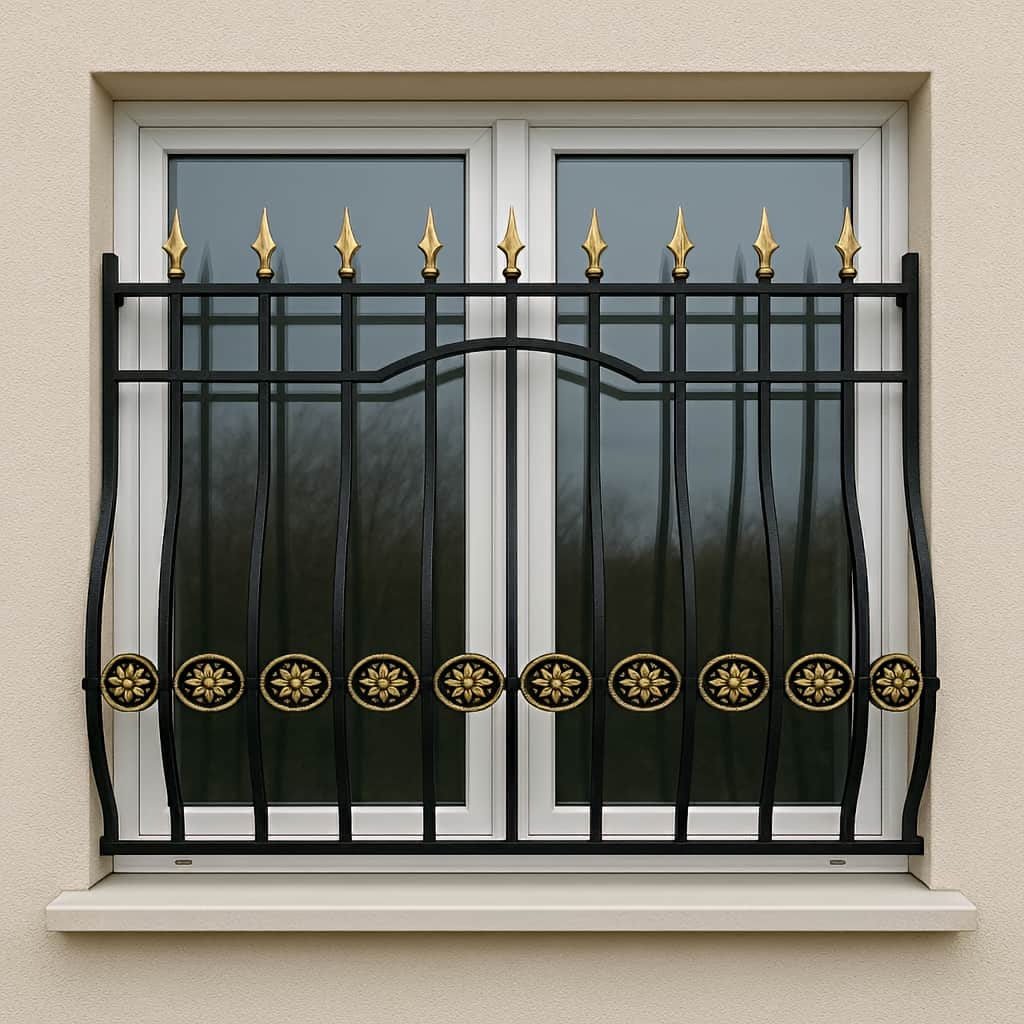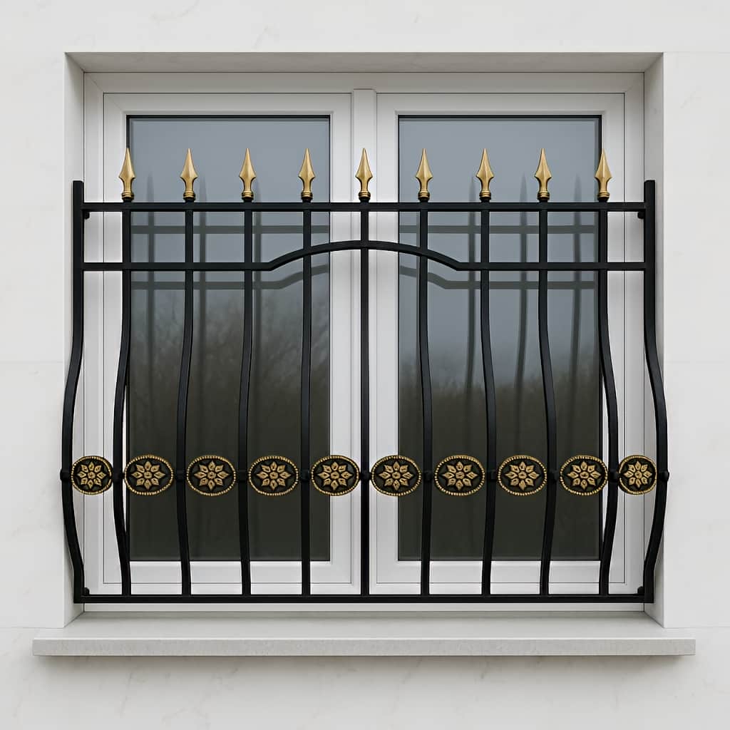 نکات کلیدی: حفاظ پنجره مدل موج سرنیزه دار با تلفیق خطوط خمیده, تزئینات فلزی و سرنیزه های بازدارنده, انتخابی امن و زیبا برای انواع ساختمان ها است.