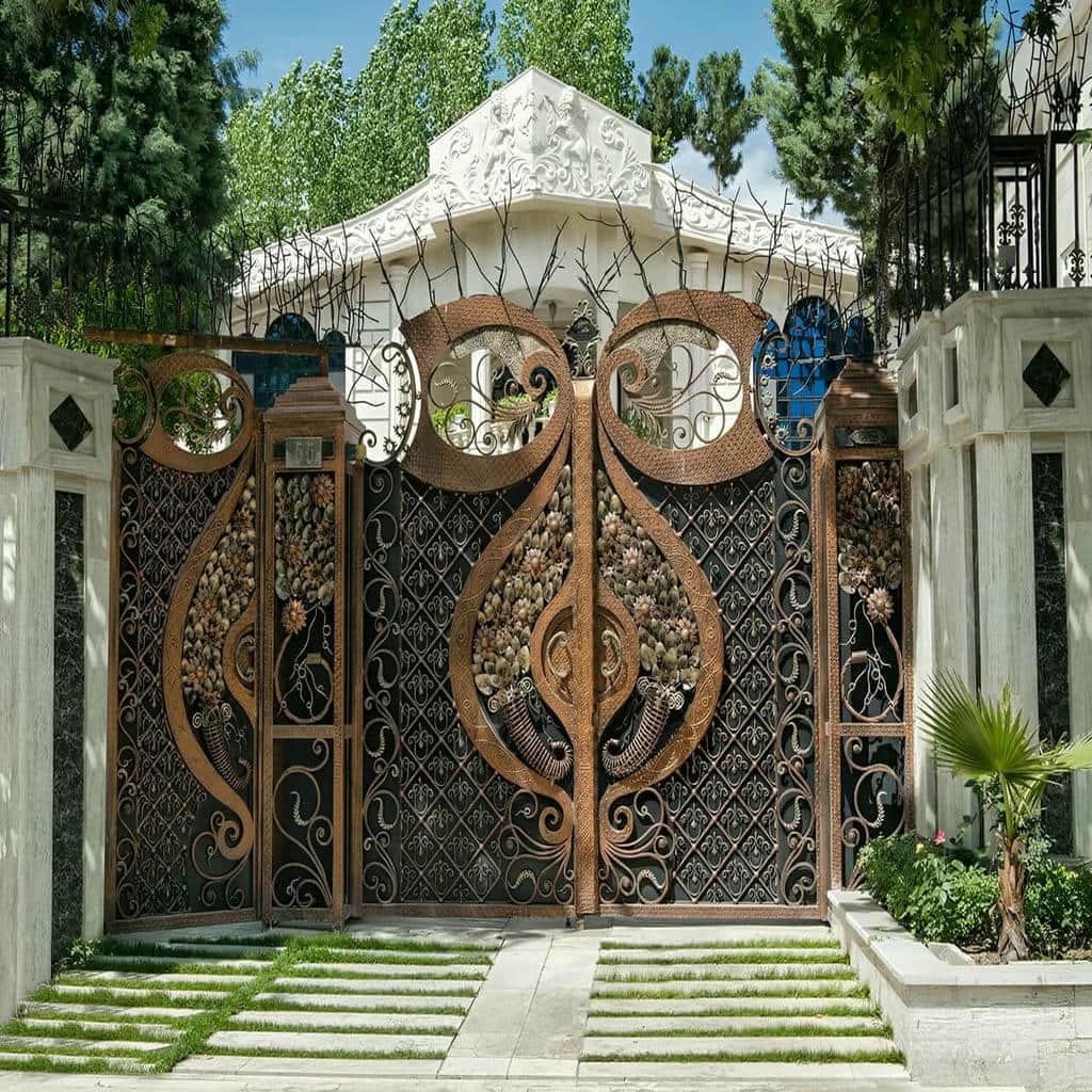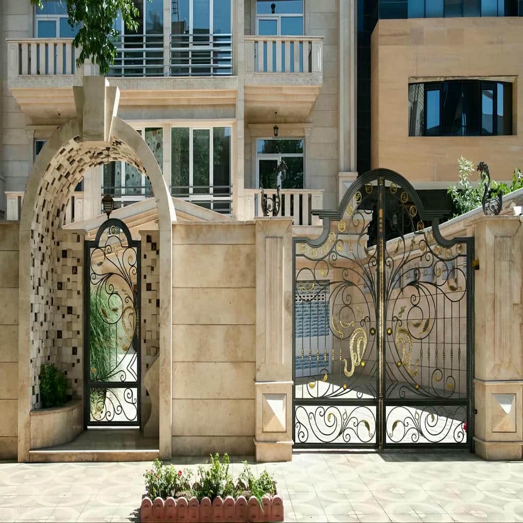 درب آهنی ورودی ساختمان ورودی ویلا علاوه بر تأمین امنیت, نقش مهمی در زیبایی ظاهری نما ایفا می کند. در پروژه های ویلایی, معمولاً از طرح های خاص با جزئیات فرفورژه, تاج های تزئینی یا ترکیب فلز و شیشه استفاده می شود. در فرفورژه سازان, طراحی بر اساس سلیقه مشتری و نوع نمای ویلا انجام می شود تا تناسب بین درب, دیوار و نرده ها برقرار باشد. درب های ورودی ویلا معمولاً با ابعاد بزرگ تر ساخته می شوند و از قاب های فولادی سنگین استفاده می کنند تا وزن لنگه ها را تحمل کنند. لولاهای صنعتی و قفل های ایمن در ساختار این درب ها تعبیه می شود تا عملکردی نرم, بی صدا و پایدار داشته باشند. در صورت تمایل, می توان از ورق پشت کار یا CNC برای ایجاد حریم خصوصی بیشتر استفاده کرد. ترکیب رنگ های تیره و پتینه طلایی جلوه ای لوکس به ورودی ویلا می دهد و می توان با نورپردازی مناسب, زیبایی طرح فرفورژه را در شب دوچندان کرد.