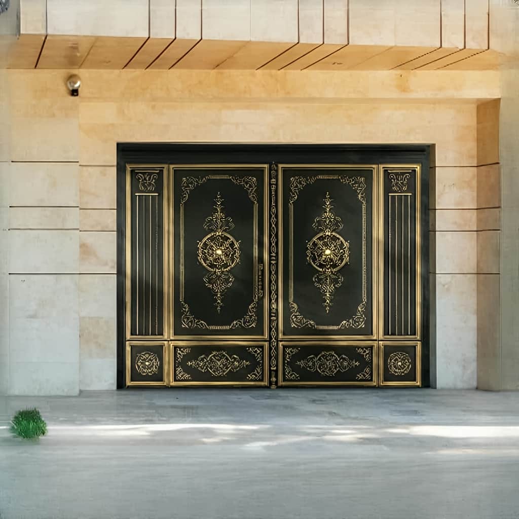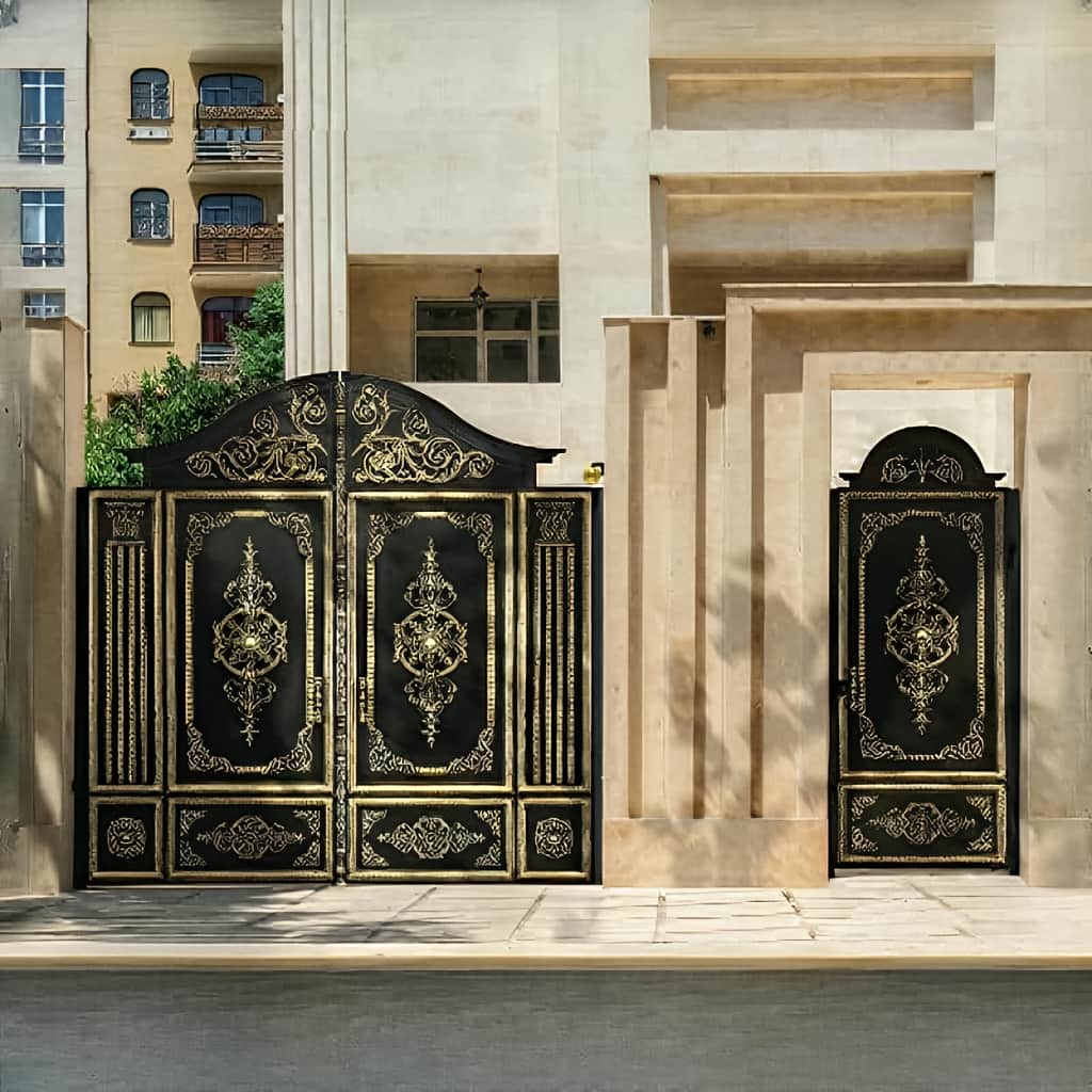 درب صدفی ورودی ویلا و ساختمان جلوه ای کلاسیک و چشم نواز به محوطه می دهد. فرم صدفی در بخش مرکزی با جزئیات فرفورژه گل دار ترکیب شده و حس هنری و تجمل را به بیننده منتقل می کند. این مدل با رنگ های متنوع مانند طلایی, سفید یا مشکی قابل سفارش است و با نماهای سنگی و گچ بری شده هماهنگی کاملی دارد. علاوه بر زیبایی ظاهری, این درب دارای استحکام بالا و امنیت کافی است تا هم نمای ظاهری و هم عملکردی مطلوب ارائه دهد.